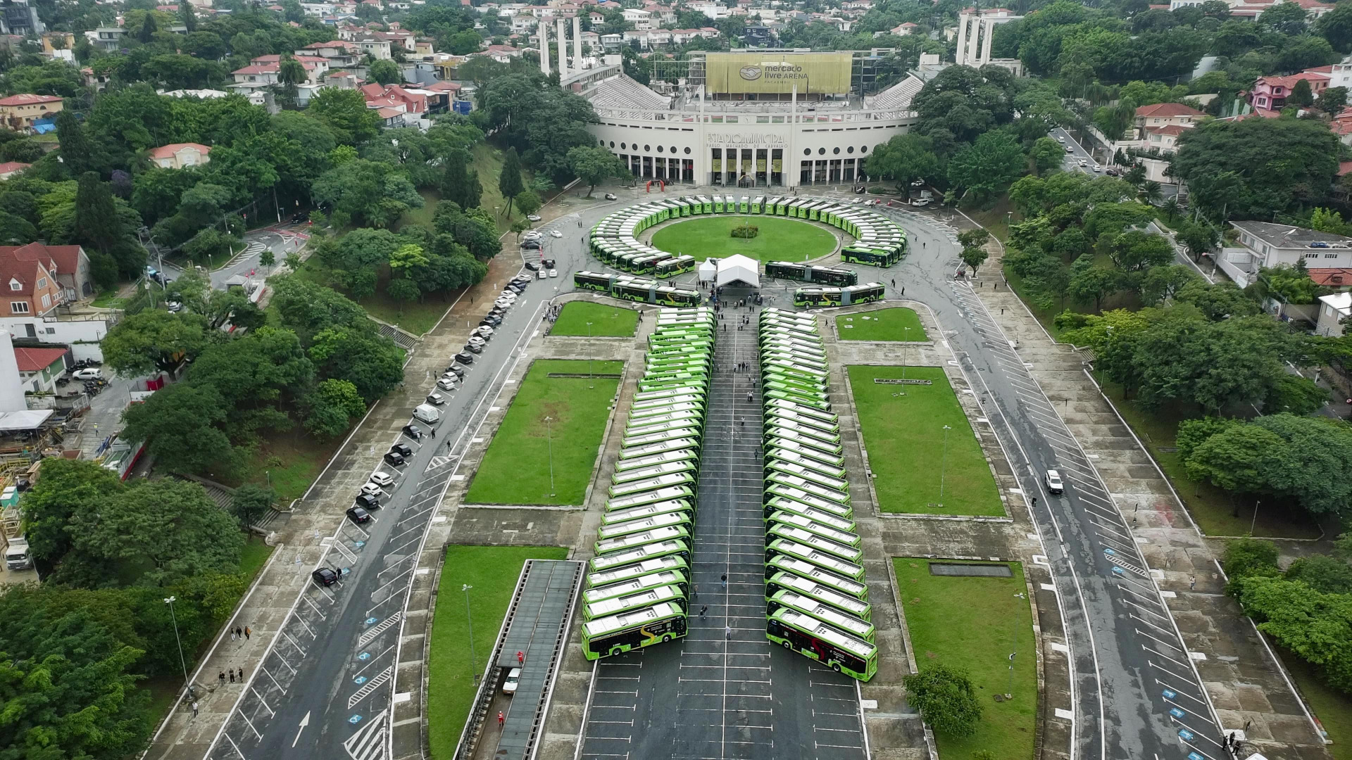 Ao todo, 110 ônibus elétricos foram apresentados, reforçando a estratégia da cidade de ampliar a mobilidade sustentável.