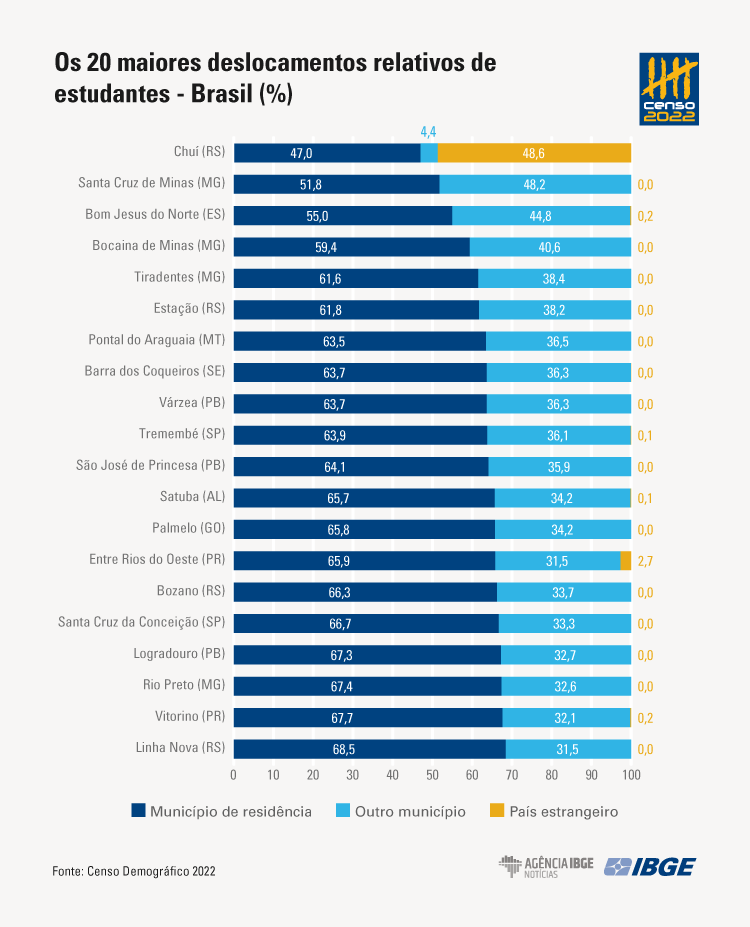 O Censo 2022 também investigou o deslocamento para estudo. Dentre as 53,6 milhões de pessoas residentes em domicílios particulares no Brasil que frequentam alguma instituição de ensino, 49,7 milhões (92,7%) se deslocam para locais dentro do seu próprio município de residência, enquanto 3,8 milhões (7,2%) o fazem em outro município, e 75 mil (0,1%) em um país estrangeiro.