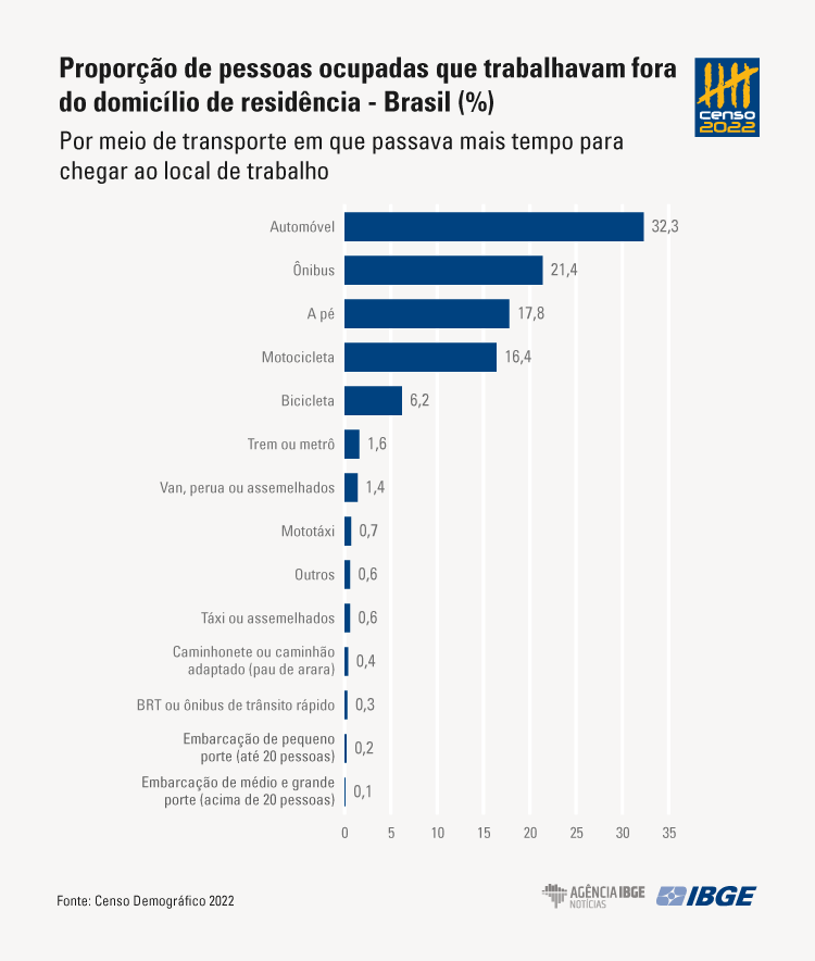 O Censo 2022, de modo inédito, investigou o meio de transporte que a população do Brasil passa mais tempo no deslocamento para o trabalho. A pesquisa revela que há um predomínio do uso de automóvel (32,3%), ônibus (21,4%) e motocicleta (16,4%), além da locomoção a pé (17,8%), como meios de transporte, representando 87,9% do deslocamento para trabalho no país. Em valores absolutos, 48,9 milhões de pessoas usam esses meios de transporte motorizados: 22,6 milhões de pessoas, o automóvel; 14,9 milhões, o ônibus; e 11,4 milhões, a motocicleta. "Tal cenário reflete o histórico do país em privilegiar rodovias para a integração das cidades e regiões, além do descompasso entre crescimento urbano e oferta de transporte público", afirma Mauro.