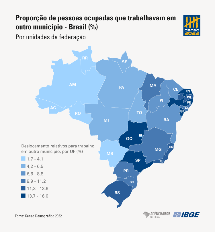 No âmbito regional, os estados de São Paulo (13,7%), Goiás (13,7%), Rio Grande do Norte (15,5%), Sergipe (16,0%) e Pernambuco (15,2%) apresentam os percentuais mais elevados de população ocupada que se desloca para trabalhar em outro município. Esses valores decorrem dos fortes processos de integração que existem entre municípios, especialmente aqueles que compõem concentrações urbanas. Em São Paulo, por exemplo, 2,8 milhões de pessoas ocupadas se deslocam para trabalhar em outro município, o que representa 30,5% do total de pessoas que se deslocam para trabalho em outro município no Brasil.