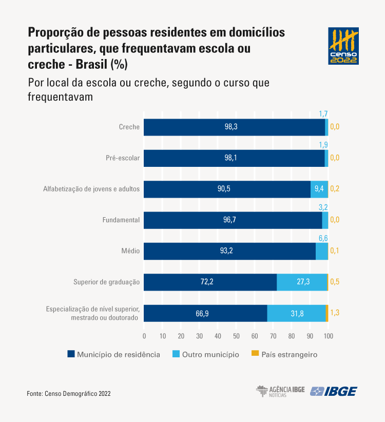 O Censo 2022 também investigou o deslocamento para estudo. Dentre as 53,6 milhões de pessoas residentes em domicílios particulares no Brasil que frequentam alguma instituição de ensino, 49,7 milhões (92,7%) se deslocam para locais dentro do seu próprio município de residência, enquanto 3,8 milhões (7,2%) o fazem em outro município, e 75 mil (0,1%) em um país estrangeiro.