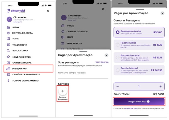 4. Em "Serviços", selecione"Comprar Passagens" e escolha uma das opçõesofertadas: passagem avulsa ou pacote de viagens diário, semanal ou mensal;