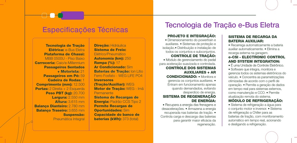 Trata-se de um ônibus do tipo padron, com capacidade para 82 passageiros, entre sentados e em pé, e aproximadamente 12,5 metros de comprimento. O chassi é Mercedes e a carroceria, Caio. O modelo é produzido pela Eletra, empresa 100% brasileira fabricante de ônibus elétricos que, por meio do serviço Eletra Consult, também oferece consultoria e apoio técnico para implantação de sistemas de mobilidade elétrica, desde a escolha das infraestruturas mais adequadas, passando pela análise das linhas de financiamento no mercado até o pós-venda e treinamento de profissionais.